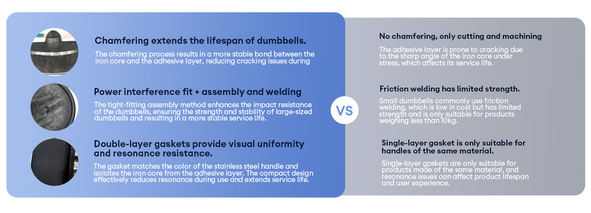 2. Pure stainless steel handle material is relatively soft and easily deformed; this structure reduces costs while ensuring the quality and lifespan of the dumbbells.