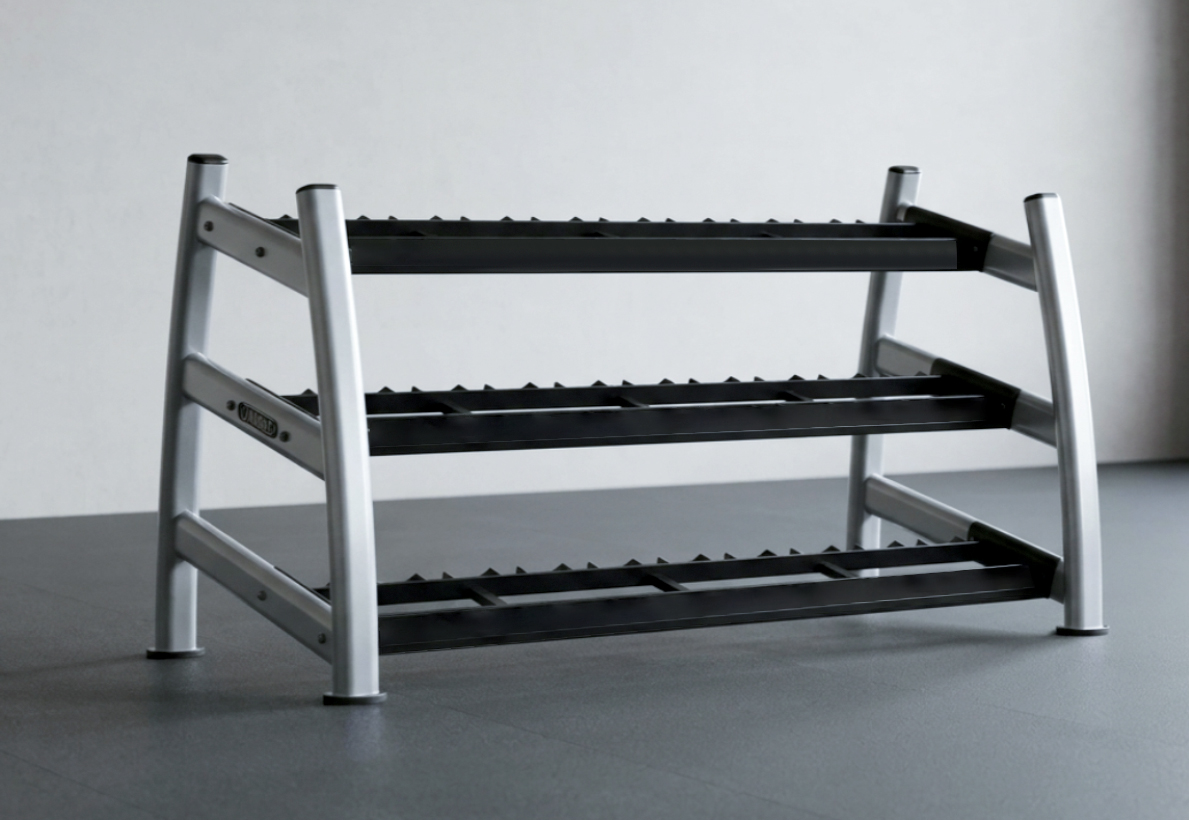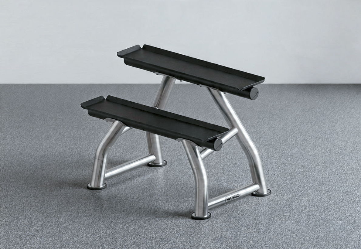 In response to the display characteristics of increasing weight for dumbbells in commercial gyms, VANBO will simultaneously launch two models of dumbbell racks: ten pairs and fifteen pairs. The overall frame uses Q235 steel, with thicker pipe walls and reinforced layers. The single-layer load-bearing capacity exceeds 500kg. The ten-pair model is suitable for small studios or free strength zones as a supplement, while the fifteen-pair model is targeted at the main areas of large chain clubs. The depth of the layers has been tested repeatedly, ensuring that dumbbells can be easily placed and removed without obstruction. The slope design with a lower front and higher back ensures stable placement. Both products adopt double-sided paint coating technology, which is rust-proof and scratch-resistant, and is suitable for high-frequency usage scenarios.